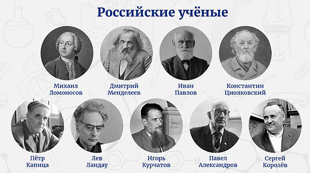 Михаил Васильевич Ломоносов, Иван Петрович Павлов, Дмитрий Иванович Менделеев, Константин Эдуардович Циолковский, Петр Леонидович Капица, Лев Давидович Ландау, Игорь Васильевич Курчатов, Павел Сергеевич Александров, Сергей Павлович Королев, Андрей Дмитриевич Сахаров — вот только малая часть имен российских ученых, внесших вклад в мировую науку. Немало российских и советских ученых были отмечены Нобелевскими премиями.